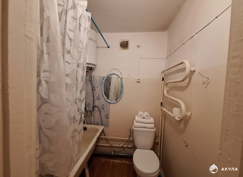 Ванная: водонагреватель на 50 литров, зеркало, угловая полка, карниз под штору и штора.