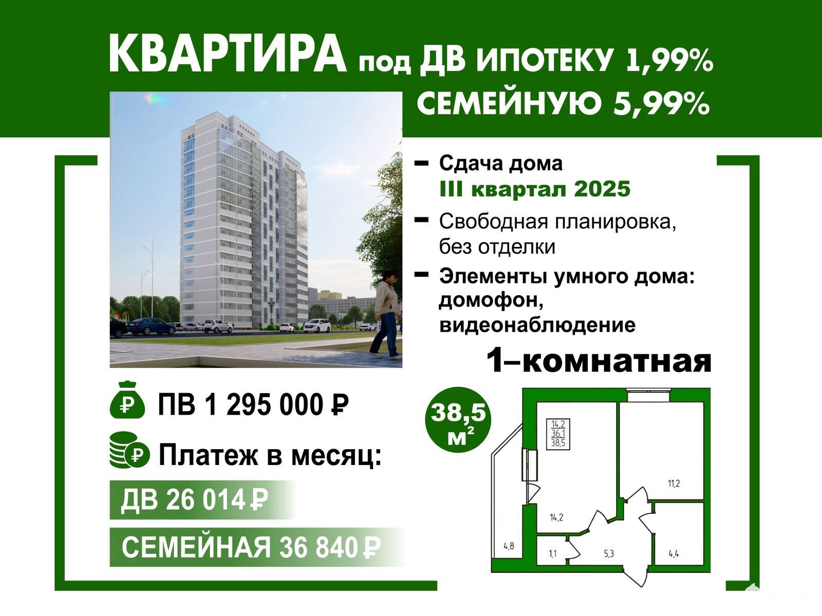 Обязательно наличие минимального первоначального взноса от 20, 1%.