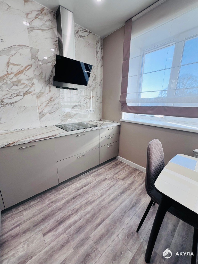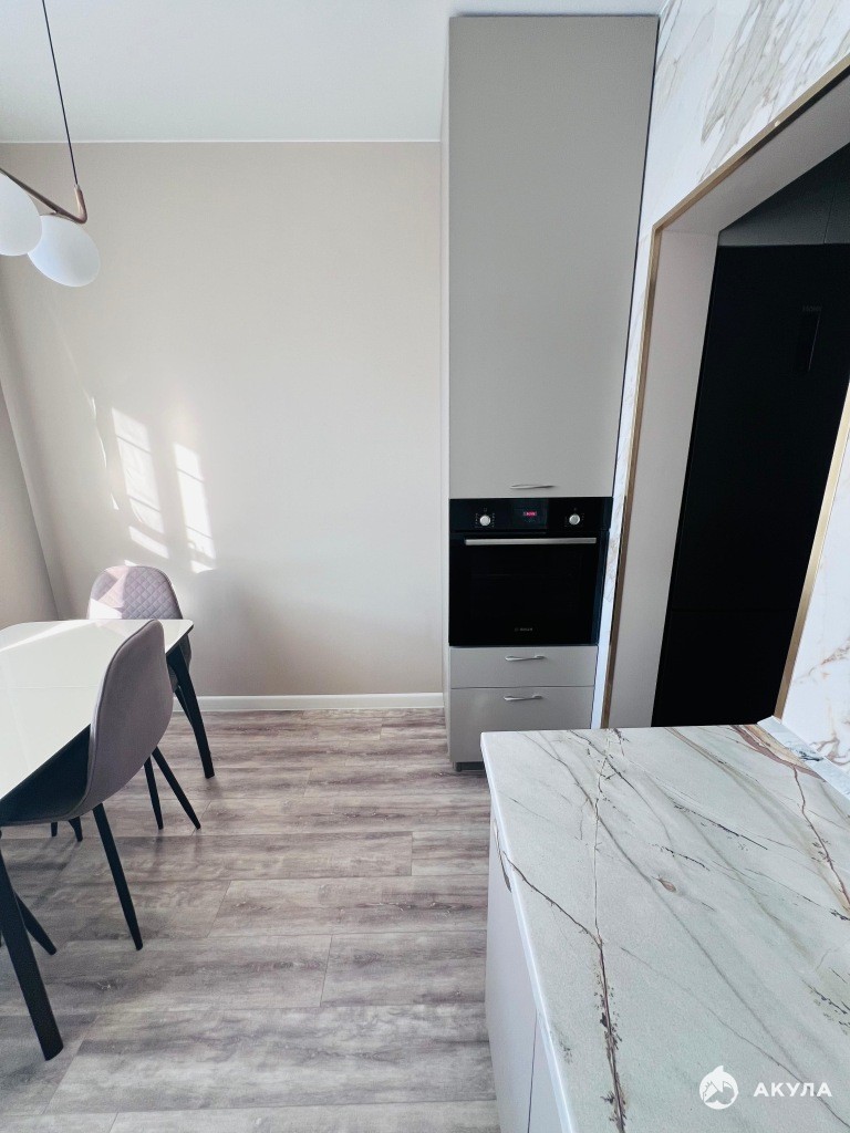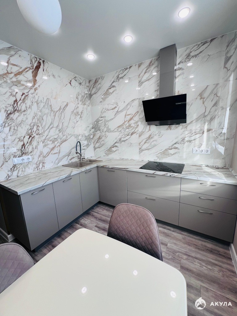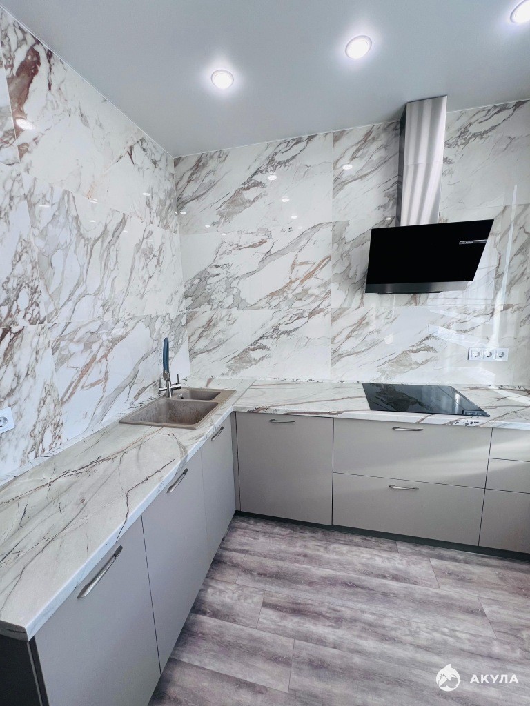 Кухня в квартире: стены керамогранит, встроенный кухонный гарнитур с техникой - вытяжка, посудомоечная машина, стиральная машина, варочная поверхность, духовой шкаф, холодильник, обеденная зона.
