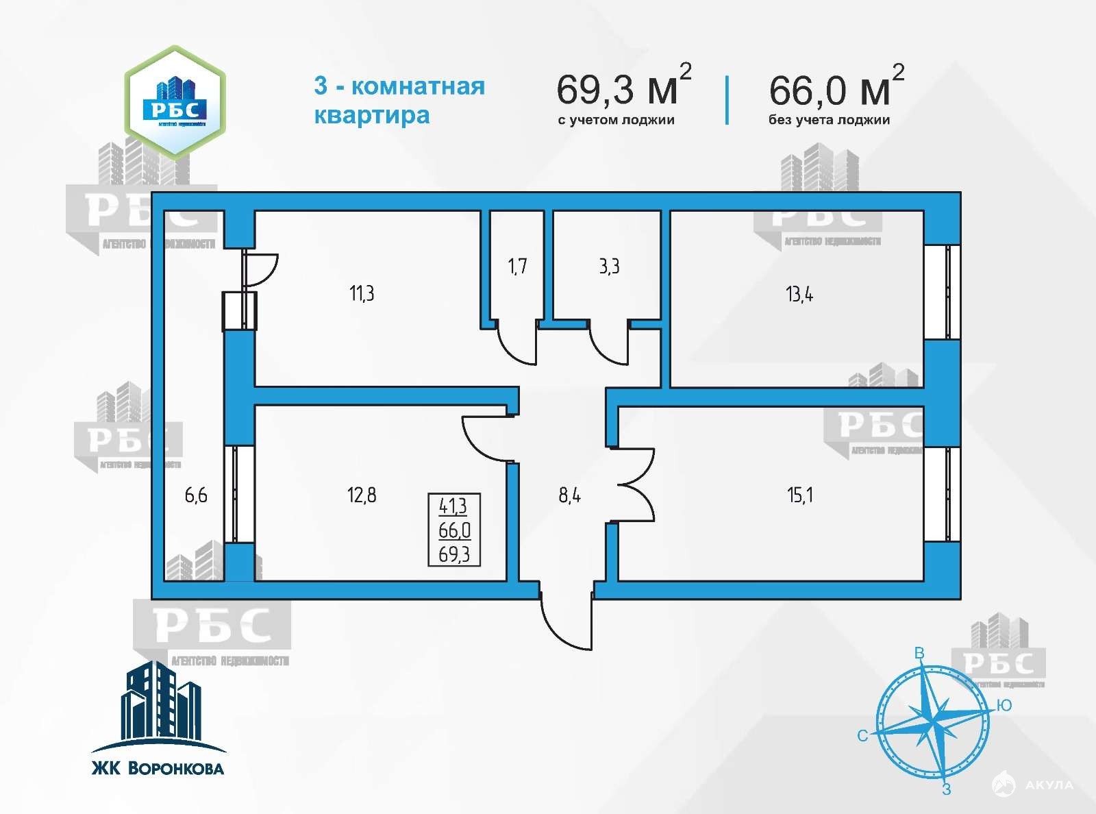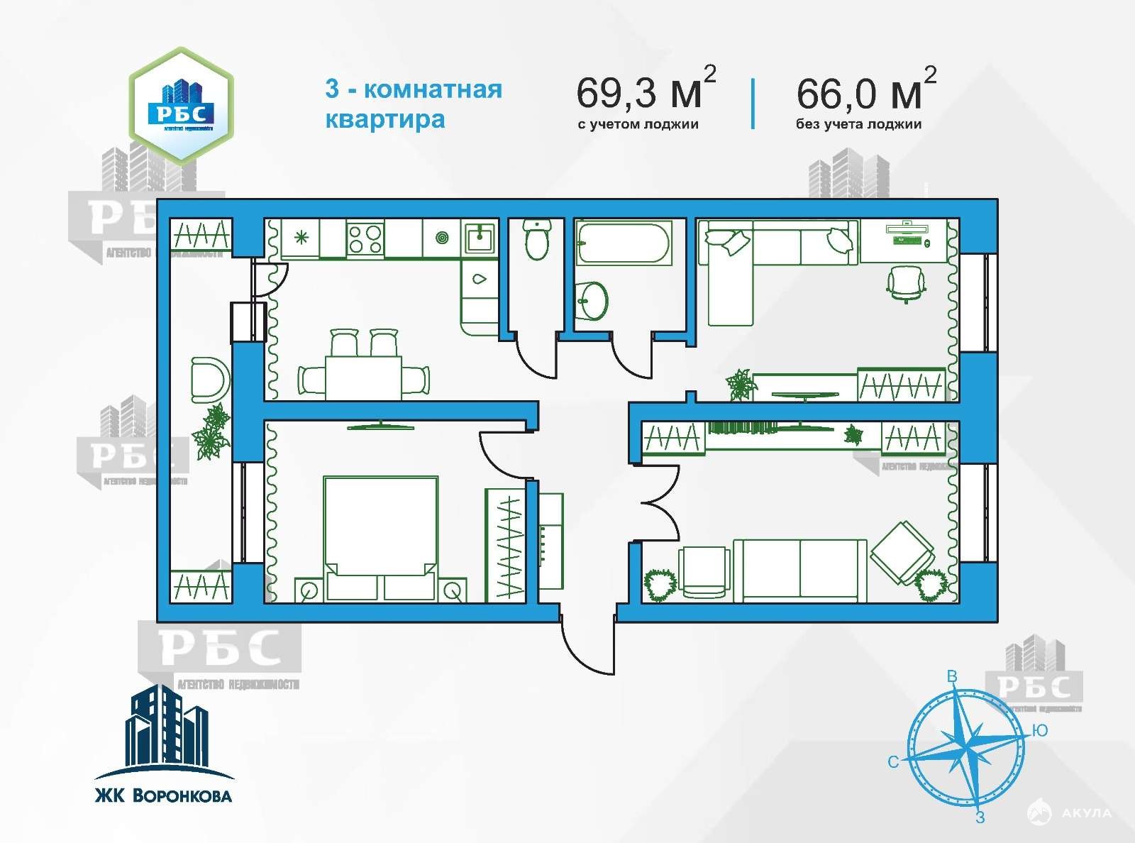 - 3-комнатная квартира 70, 0 кв.м. (с учетом холодных помещений), 66, 1 кв.м. без учета холодных помещений, на 12/16 этаже, стороны света: юг-север. Панорамное остекление лоджии.